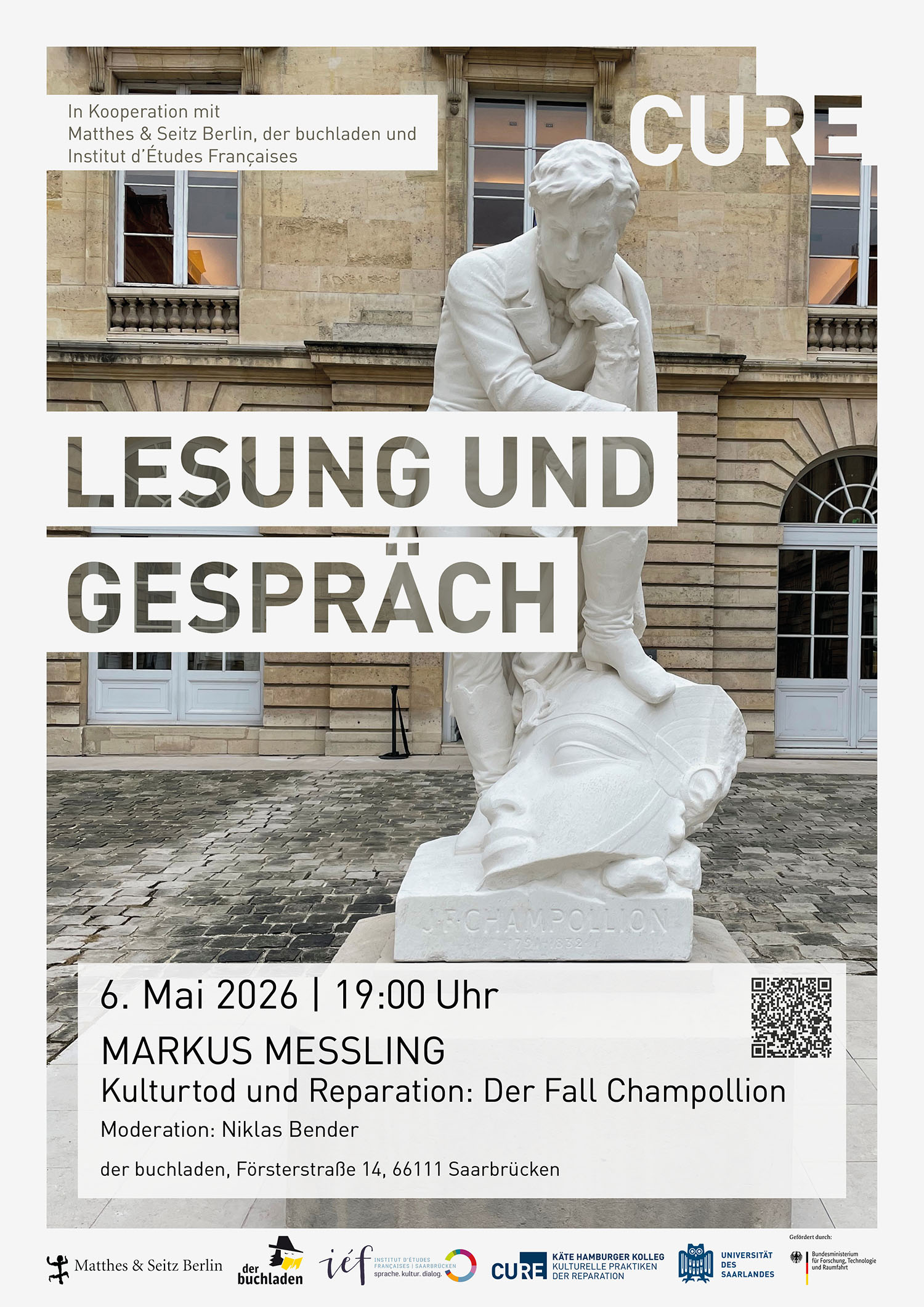 Markus Messling. Kulturtod und Reparation. Der Fall Champollion. Matthes & Seitz, 2026 (Fröhliche Wissenschaft). Also published as volume 1 of the new series Reparations, published by the Käte Hamburger Centre for Cultural Practices of Reparation (CURE) at Saarland University.
