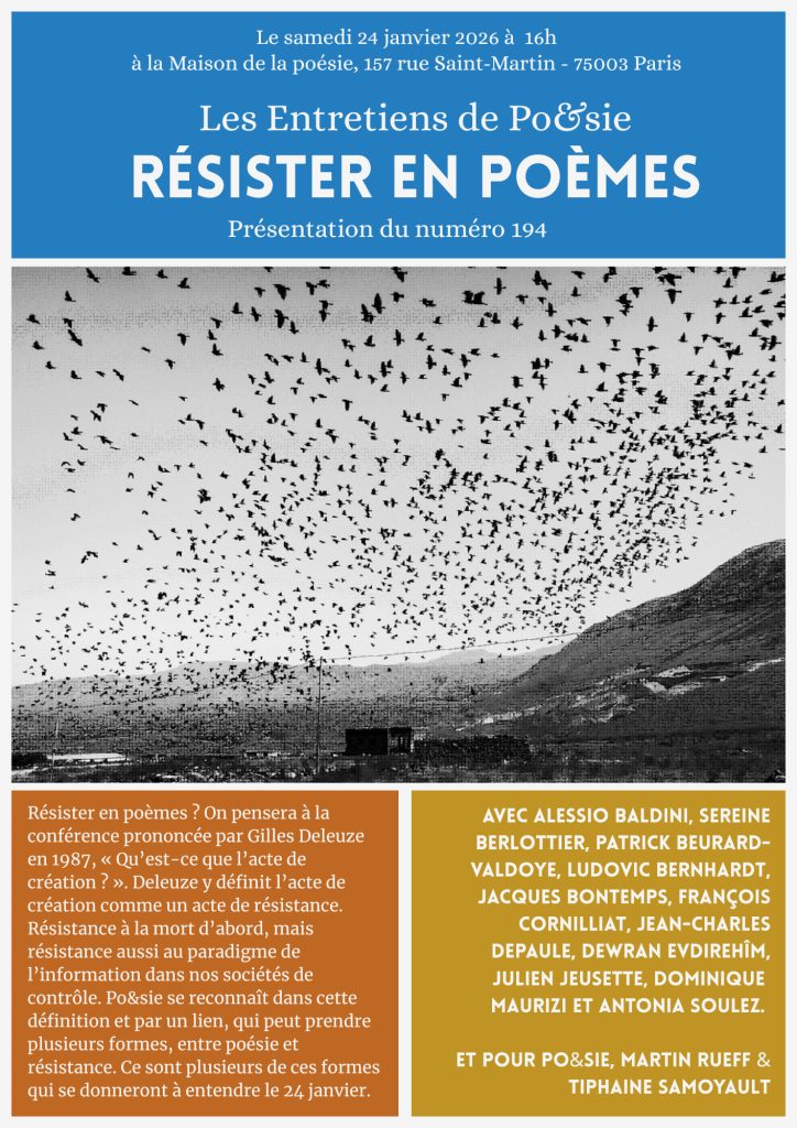 On January 24, at the Maison de la Poésie in Paris, Julien Jeusette will participate in discussions accompanying the release of issue 194 of Po&sie, which features several poems grouped under the title “résister en poèmes” (resisting through poetry). For this volume, he translated into French and introduced a dozen poems by former CURE fellow Tammy Lai-Ming Ho.