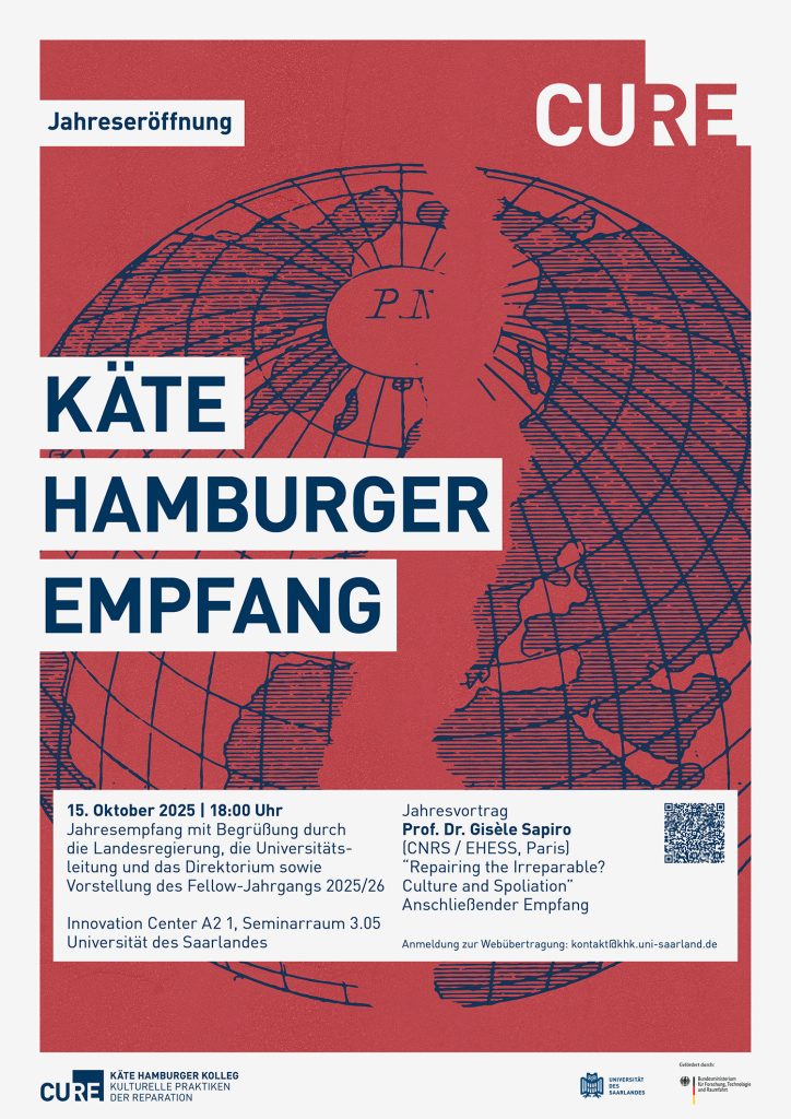 La conférence sera suivie d’une brève présentation par les nouvelles résidentes et résidents CURE de leurs travaux de recherche en allemand, anglais et français. Les chercheuses et chercheurs invités ont été sélectionnés parmi 350 postulations par le Conseil scientifique du Centre. Leurs projets sont placés sous le signe du thème directeur de la promotion « Société », qui détermine l’axe principal des études qui seront menées au cours de l’année académique 2025-2026. Au cours de leur séjour de 12 mois à Sarrebruck, ils et elles se consacreront à des projets de recherche individuels sur les pratiques culturelles de réparation et enrichiront les travaux du Centre de leurs différentes perspectives disciplinaires et leur expérience académique internationale.