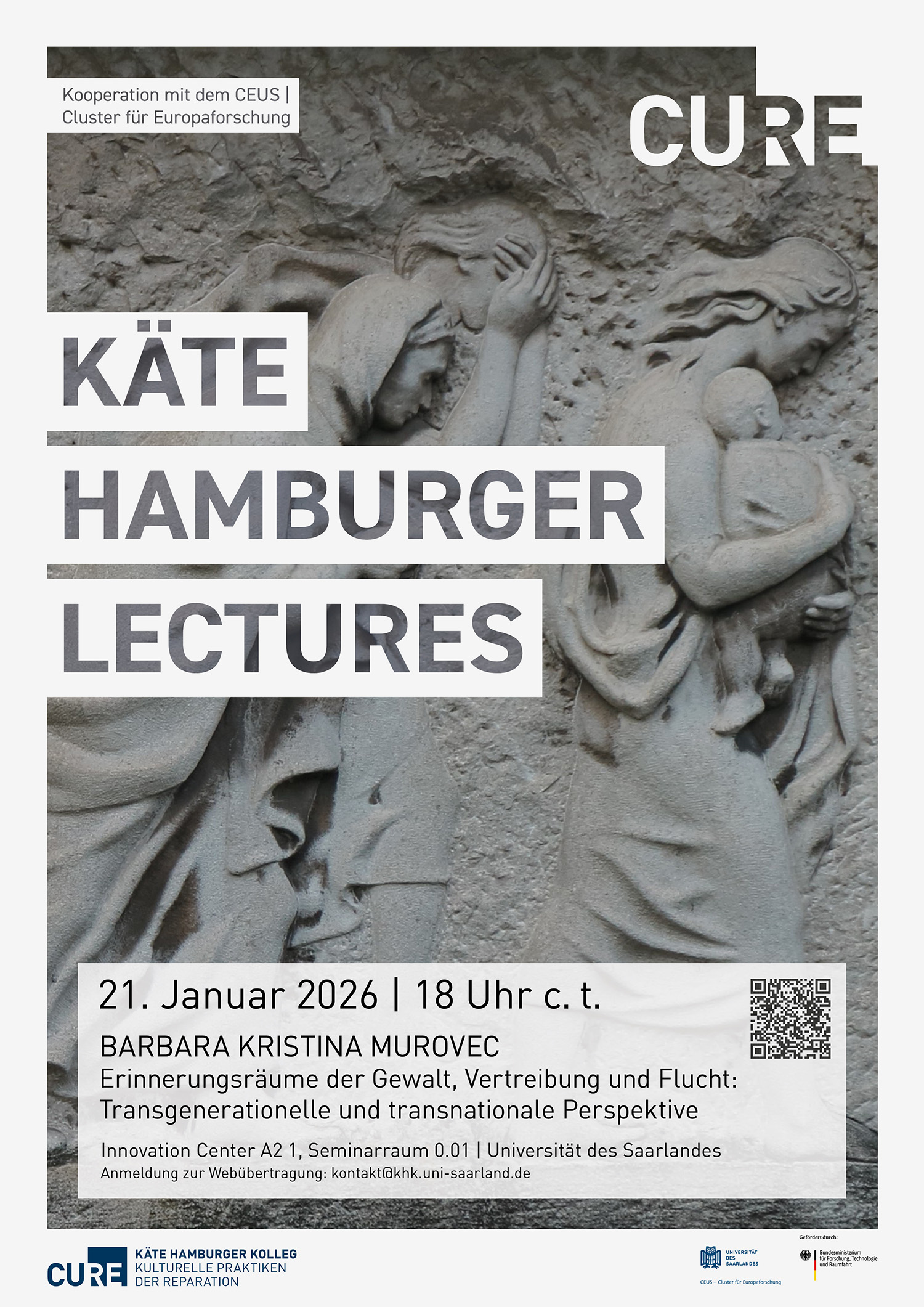 Das Käte Hamburger Kolleg für kulturelle Praktiken der Reparation (CURE) und das CEUS | Cluster für Europaforschung laden herzlich zur Käte Hamburger Lecture an der Universität des Saarlandes ein. Im Fokus der Vortragsreihe stehen aktuelle Forschungspositionen der CURE Fellows zu kulturellen Praktiken der Reparation. Nach den Vorträgen können die vorgestellten Themenschwerpunkte in einer öffentlichen Diskussionsrunde vertieft werden.