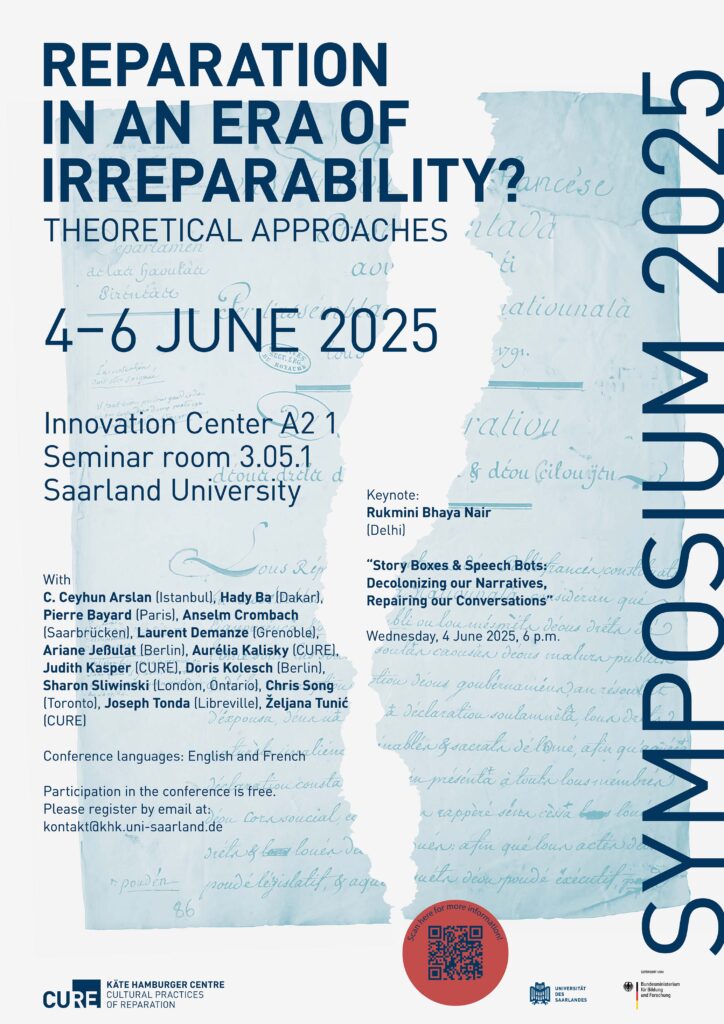 Vom 4. bis 6. Juni 2025 widmet sich die erste Jahrestagung des Käte Hamburger Kollegs CURE theoretischen Zugriffen auf kulturelle Praktiken der Reparation. Die internationale Tagung findet im Innovation Center auf dem Campus der Universität des Saarlandes (Gebäude A 2.1) statt. Eröffnet wird sie am Mittwoch, 4. Juni, um 18.00 Uhr, mit Grußworten und einer Keynote von Rukmini Bhaya Nair (Indian Institute of Technology Delhi).